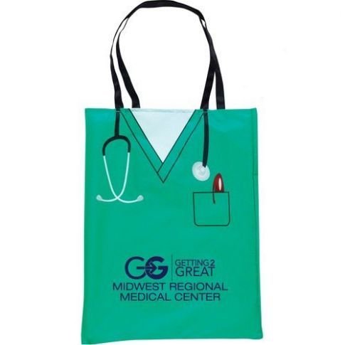 Made from 190T nylon, this fun convertible custom tote bag has an eye-catching scrub design perfect for healthcare-themed promotions. When it is not in use, the entire promo tote easily folds into a zippered pouch for easy storage