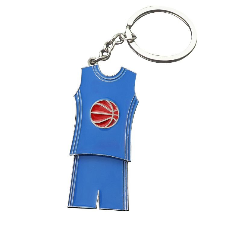 This Basketball Jersey Shaped Metal Keychain is made of metal. It features a split ring and metal link chain.