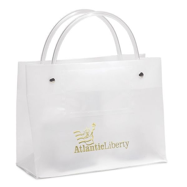 Make an impression with this executive-style Promotional Frosted Clear Tube Handle Bag with Pocket. Featuring a 3.25″ x 2.25″ interior clear pocket to hold your business card(s) and riveted plastic tube handles to ensure durability.