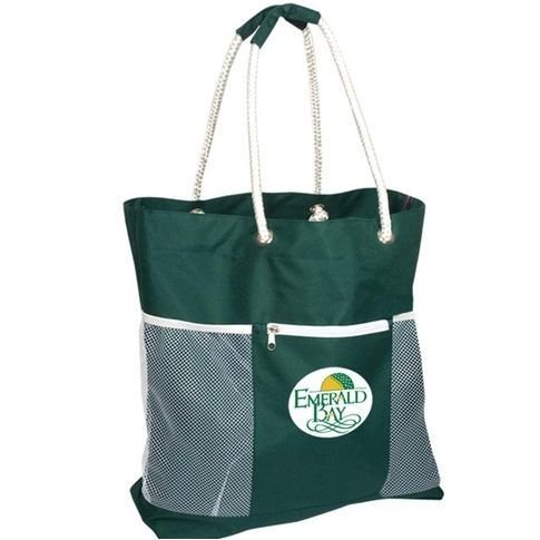 Built for days in the sun and sand, this Seaside Rope Handle Promo Jumbo Tote features heavy duty rope handles with padded grips and mesh pockets for wet items. Made of 600d polyester and also features a zippered front pocket and inside zippered safety pouch.