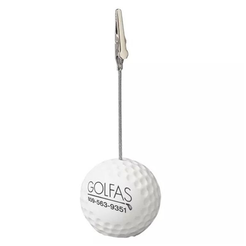 This golf ball memo holder features weighted golf-shaped base with one clip attached to a wire-rope style cable.